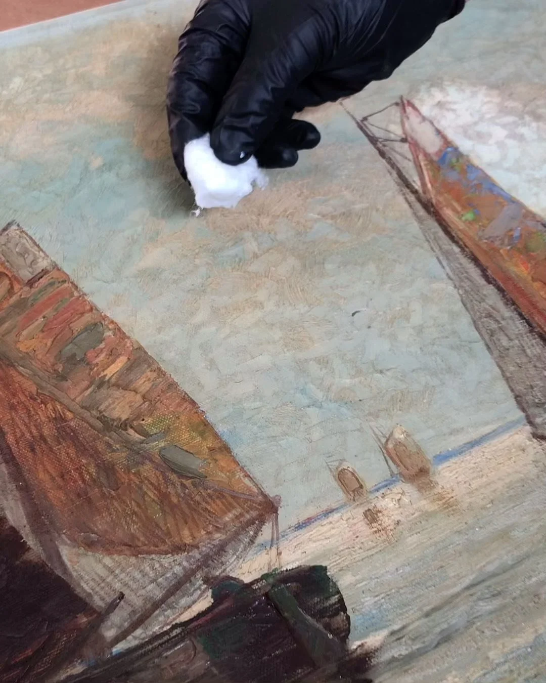 Each project is carefully considered for the damage and quality of the medium to assess the best solution for its repair. The varnish on these paintings was cracking and yellowing from improper storage. The varnish was thoroughly removed, a few blemishes were inpainted, then a new coat of varnish was applied.